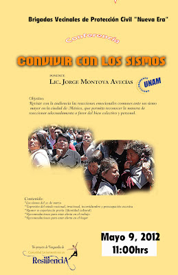 Una conferencia dirigida a Voluntarios de protección Civil que han atendido las crisis provocadas por los más recientes sismos. La Población sigue con la inquietud y como resultado con la preocupación sobre el posible BIG ONE que desde ddecadas atrás se presume se presentará; lo mejor ante esta situación es la educación en la adversidad, con un enfoque humano se presentan Daniel Carbajal y Jorge Montoya en las Instalaciones del Grupo Brigadas Vecinales de Protección Civil "Nueva Era" la dirección del Territorial Morelos: Juan Cuamatzi #86 entre Congreso de la Unión y San Ciprián. Como referencia, está ubicada detrás del restaurante Wings que está en la esquina de Fray Servando y Congreso de la Unión.